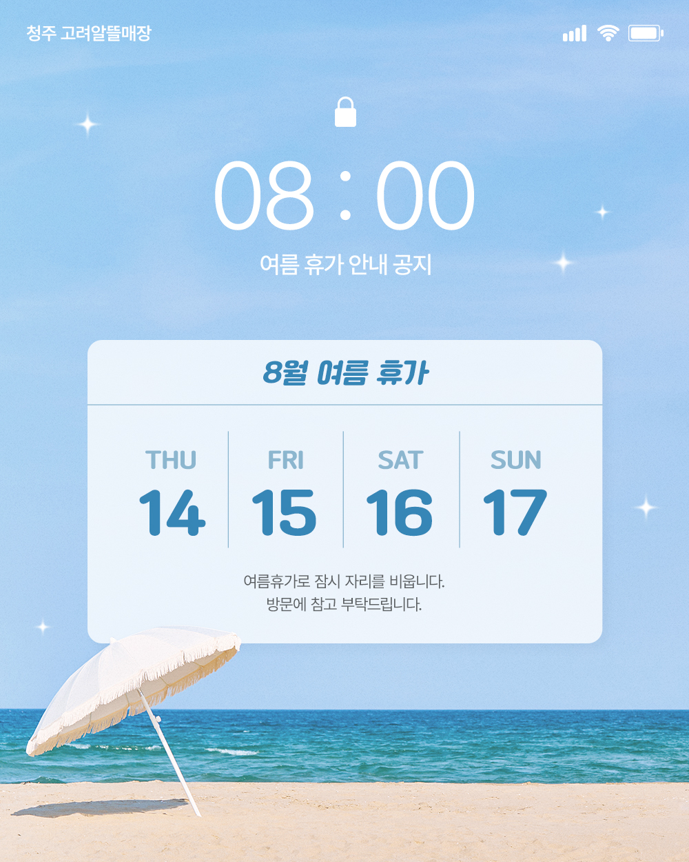 25년 8월 14일(목) ~ 8월 17일(일) 까지 여름 휴가로 인해 휴무입니다.